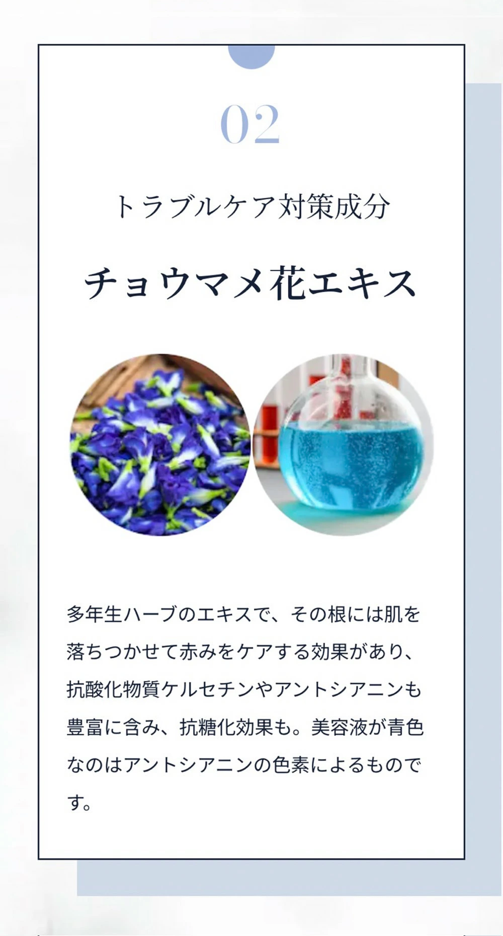 チョウマメ花エキスのブルー色がキレイで、使うたびにテンションが上がります。抗酸化作用があるとのことで、目元のくすみも気にならなくなってきた気が。見た目も効果も◎