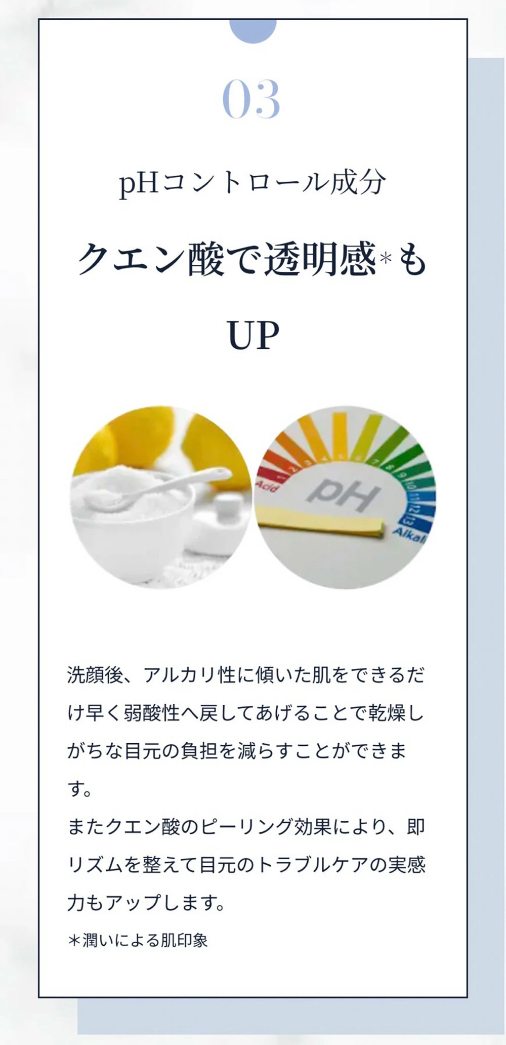 またクエン酸のピーリング効果により、即リズムを整えて目元のトラブルケアの実感力もアップします。