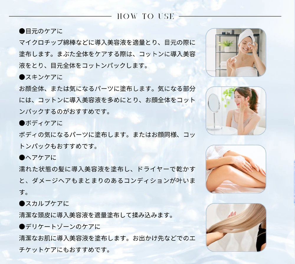 通常の水と比べ浸透圧が高く、表面張力が低いため馴染みやすく、スピーディな導入を叶えます。まつ毛ダニや顔ダニにアプローチしてクリアな状題へみちびく効果も。